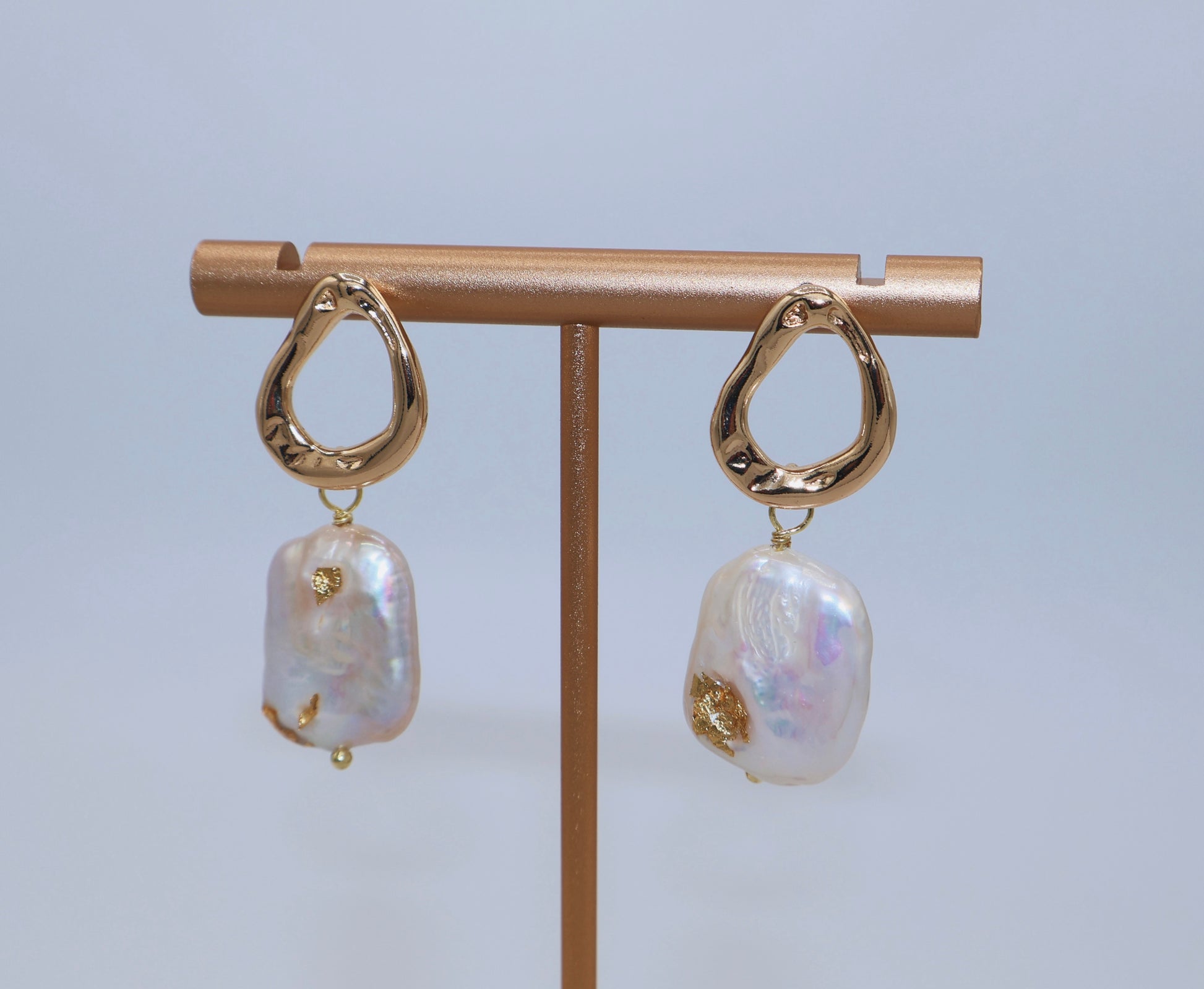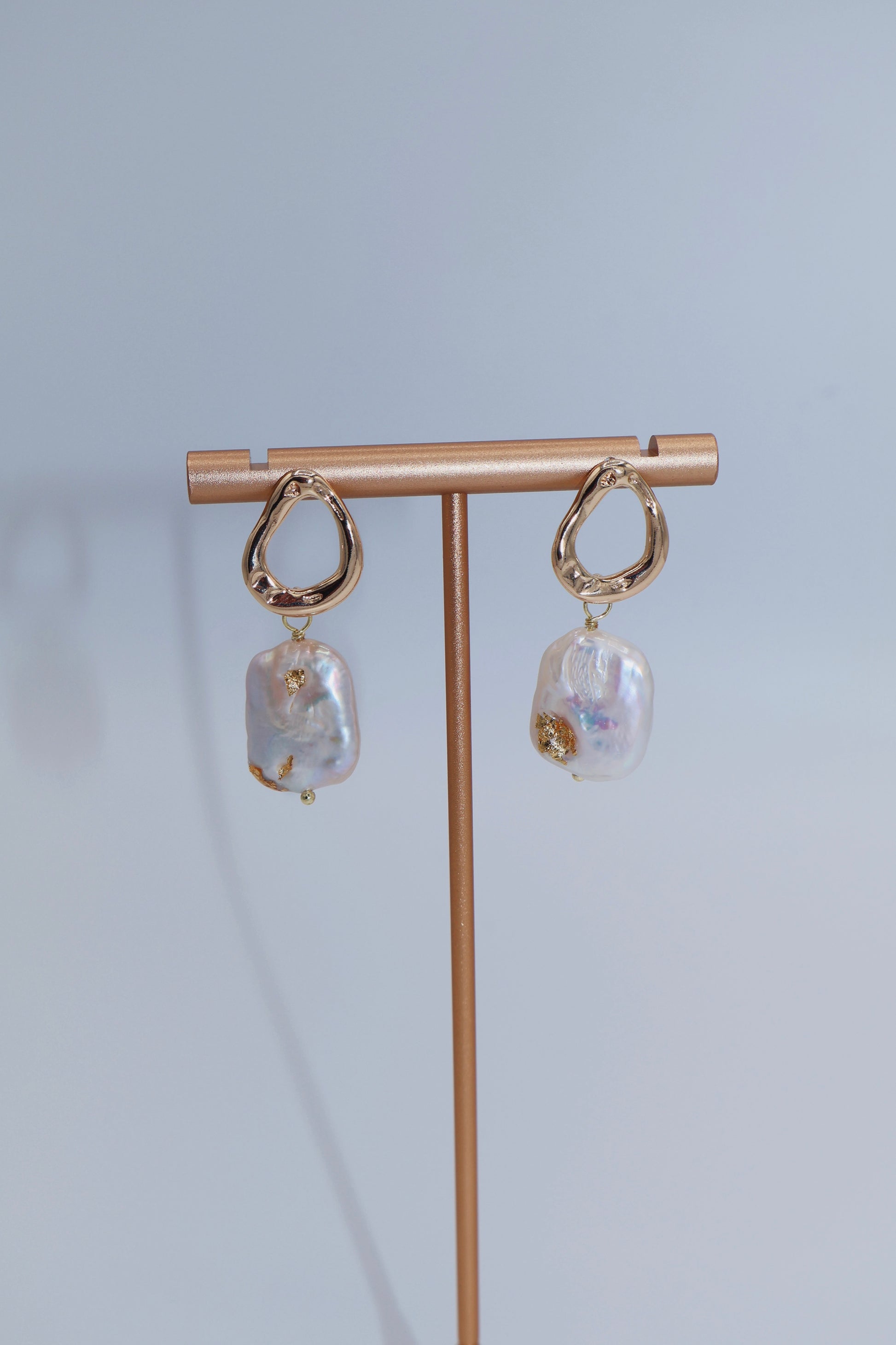 Inanna pearl earrings feature luminous freshwater pearls delicately released from a droplet-like gold circle, creating a graceful look. The soft movement of the pearls paired with the warm, radiant gold evokes a sense of divine femininity and timeless elegance.
