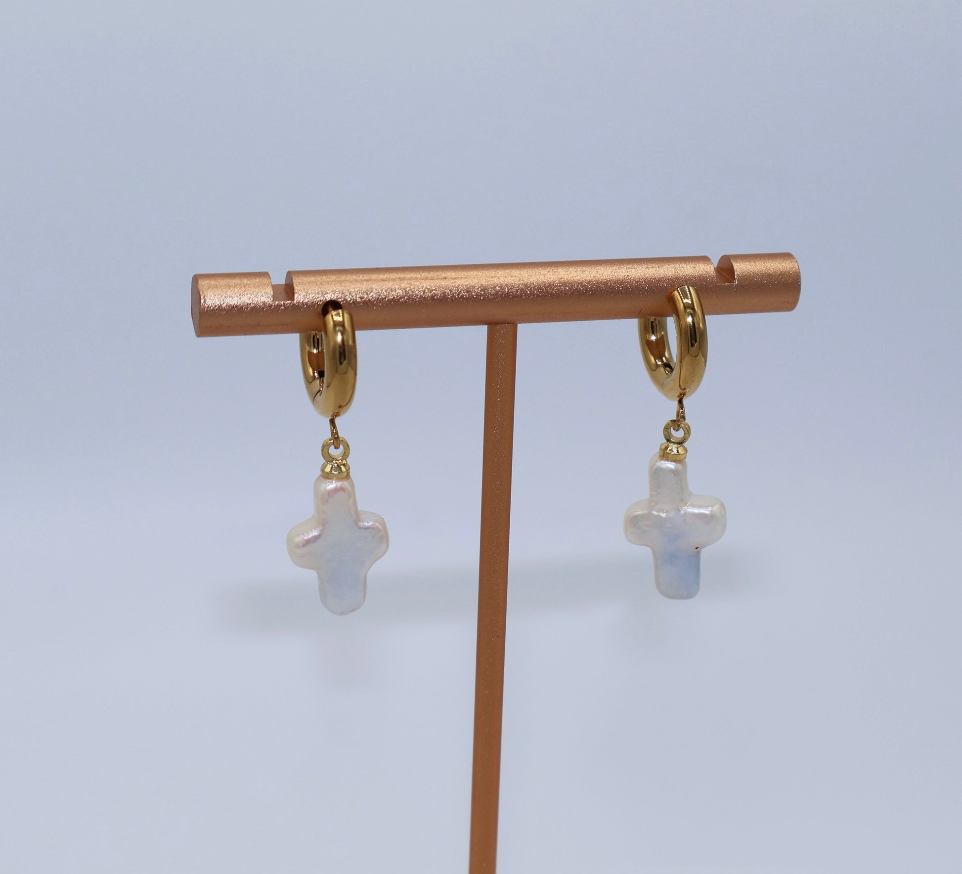 Elevate your look with the radiant charm of our Imelda Pearl Earrings—a delicate fusion of faith, beauty, and celestial grace. These small yet striking earrings feature lustrous baroque pearls paired with a minimalist cross design, capturing the light and the spirit in every detail.